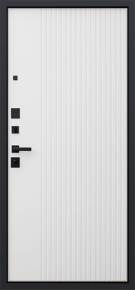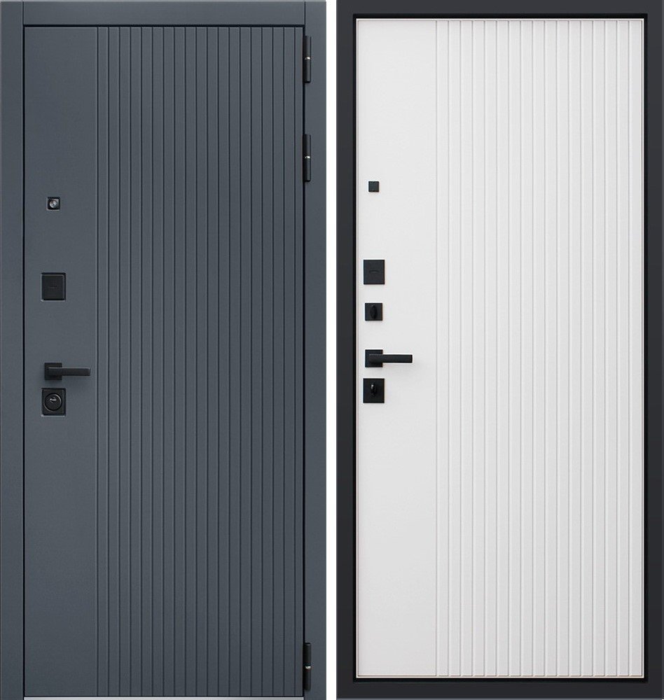 Порошковое покрытие "муар черный". Экошпонированная панель МДФ 10 мм. Линейная фрезеровка. Цвет "графит". Наличник МДФ гладкий 80 мм. Цвет "графит".