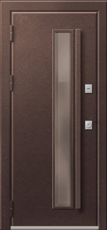 В конструкции двери Т-4 PREMIUM используется двухкамерный стеклопакет толщиной 48 мм. Стекло цвета Bronze с низкоэмиссионным энергосберегающим покрытием, сохраняет тепло внутри дома и практически исключает теплопотери. Также стоит отметить тяговую ручку. Механизм открывания, встроенный в ручку, - со